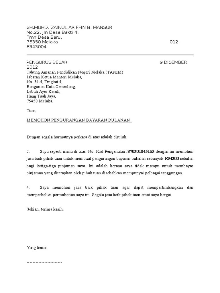 Contoh surat rayuan penangguhan bayaran pinjaman bank kecemasan h. Boleh email tak contoh surat rayuan? Kalau dia tulis dekat status dmp postponement tuu kira da lulus utk . Pengesahan doktor berkenaan penyakit kritikal yang dihadapi; Janji surat rasmi je tuan2 puan2.xsemsetinya ikut format yg akpk bagi ni.yg akpk.